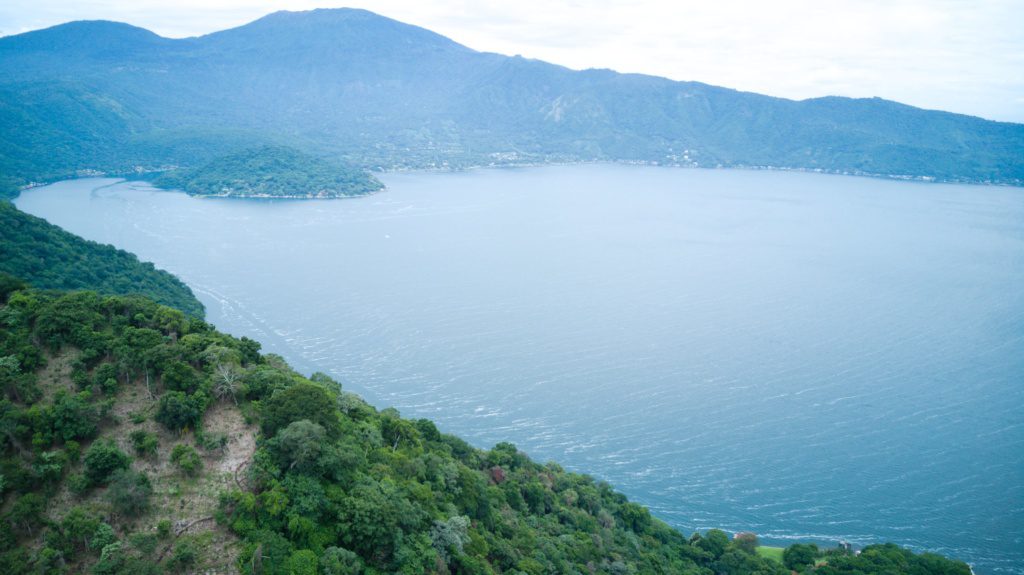Vista panorámica al lago Coatepeque desde los terrenos adquiridos por una de las sociedades controladas por Nayib Bukele.