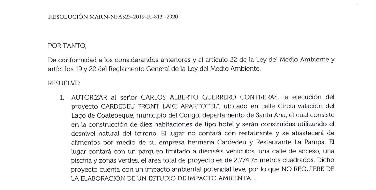 La nueva construcción del hotel se encuentra en un suelo de alto valor de recarga hídrica, entre 450 y 499 milímetros al año, según detalla la resolución del permiso ambiental con referencia MARN-NFA523-2019-R-813-2020. Con las primeras lluvias de 2020, quedó en evidencia el deficiente manejo de aguas lluvias de La Pampa, cuando la escorrentía que venía del restaurante inundó y dañó la casa de Concepción Zometa, habitante de la colonia Santa Mónica. Sin embargo, el Ministerio de Medio Ambiente resolvió en diciembre de 2020 otorgar un nuevo permiso, perdonando el estudio de impacto ambiental para el hotel Cardedeu Front Lake Apart-hotel, que se construye a la orilla del lago. El argumento del Ministerio para conceder esta autorización fue que “dicho proyecto cuenta con un impacto ambiental potencial leve, por lo que no requiere de la elaboración de un estudio de impacto ambiental”.