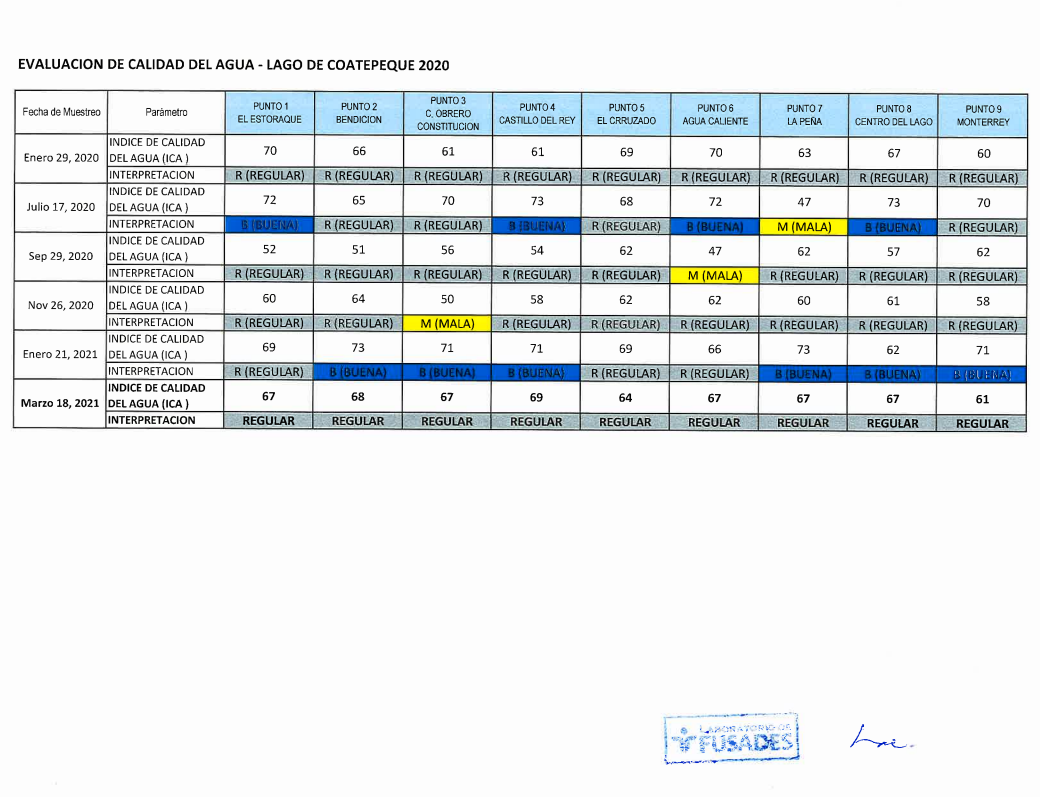 La calidad del agua varía según el punto muestreado y la época del año. Fusades y Fundación Coatepeque han evaluado nueve puntos del lago entre 2020 y 2021. En el pandémico 2020 tres de los nueve puntos dieron como resultado agua de “mala calidad”: Centro Obrero Constitución, Agua Caliente y La Peña; mientras que en 2021 los nueve puntos dieron agua “regular”. Crédito: Captura del documento.