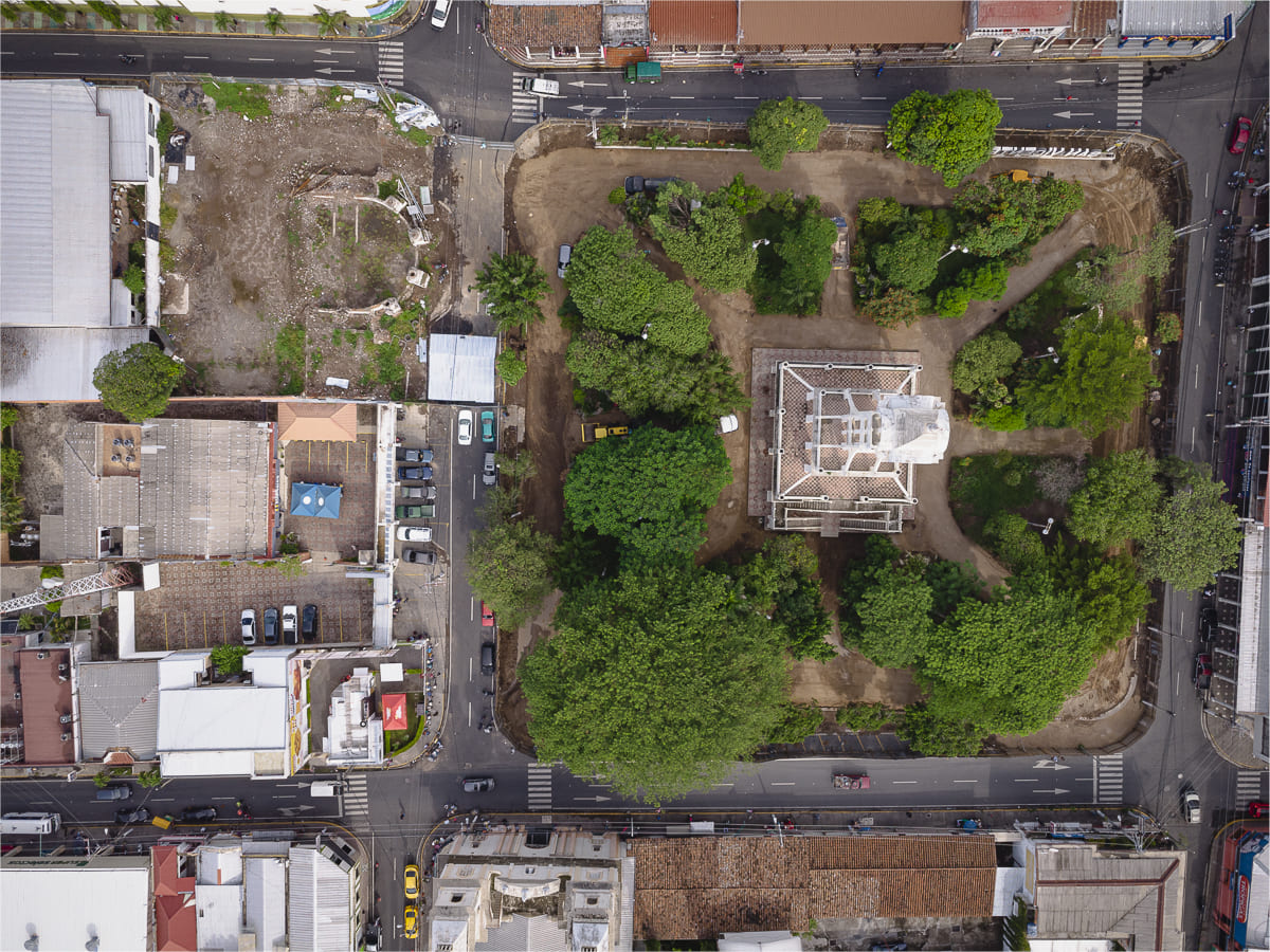 Toma aérea del centro histórico de San Vicente, al centro, el parque Cañas y al lado superior izquierdo, el terreno del palacio municipal. Ambos sin avances, después de nueve meses. (Foto FOCOS/Carlos Salvador)