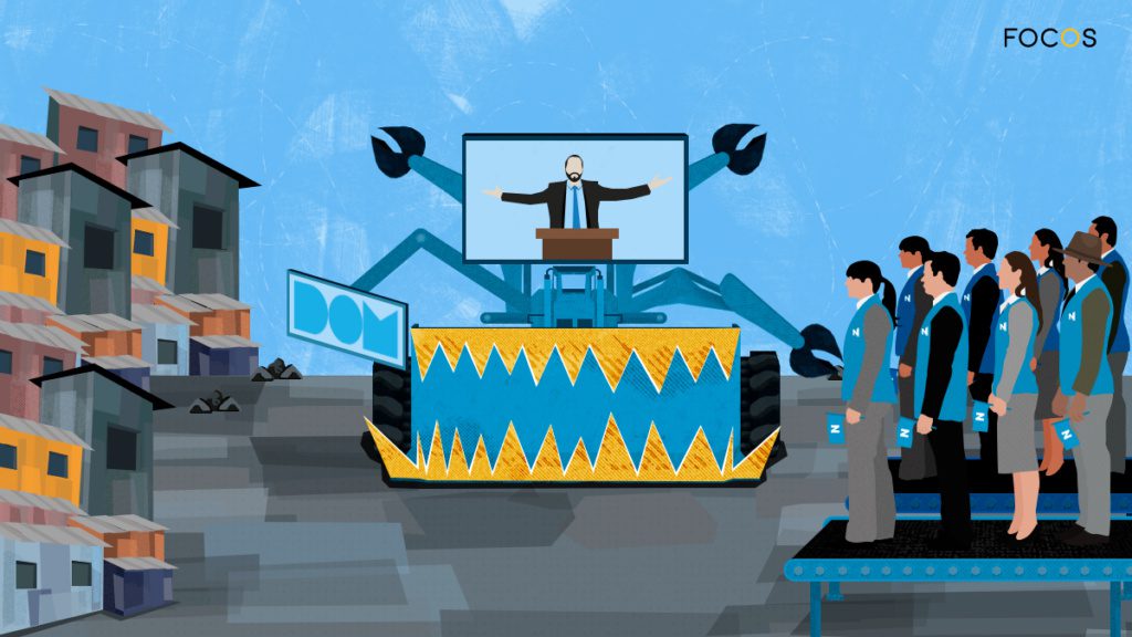 En septiembre de 2023, FOCOS reveló que la DOM repartió una piñata de $266.5 millones para ejecutar obras en los municipios a empresas sin experiencia, algunas de estas dirigidas por funcionarios del Estado; otras, a afiliados a Nuevas Ideas. Pero la apuesta por la entidad trasciende al manejo discrecional de fondos públicos. Ahora queda demostrado que colaboró de manera sistemática para empatar el  proselitismo partidista del partido de Bukele con la presentación de proyectos pagados con fondos públicos de cara a las elecciones municipales.
